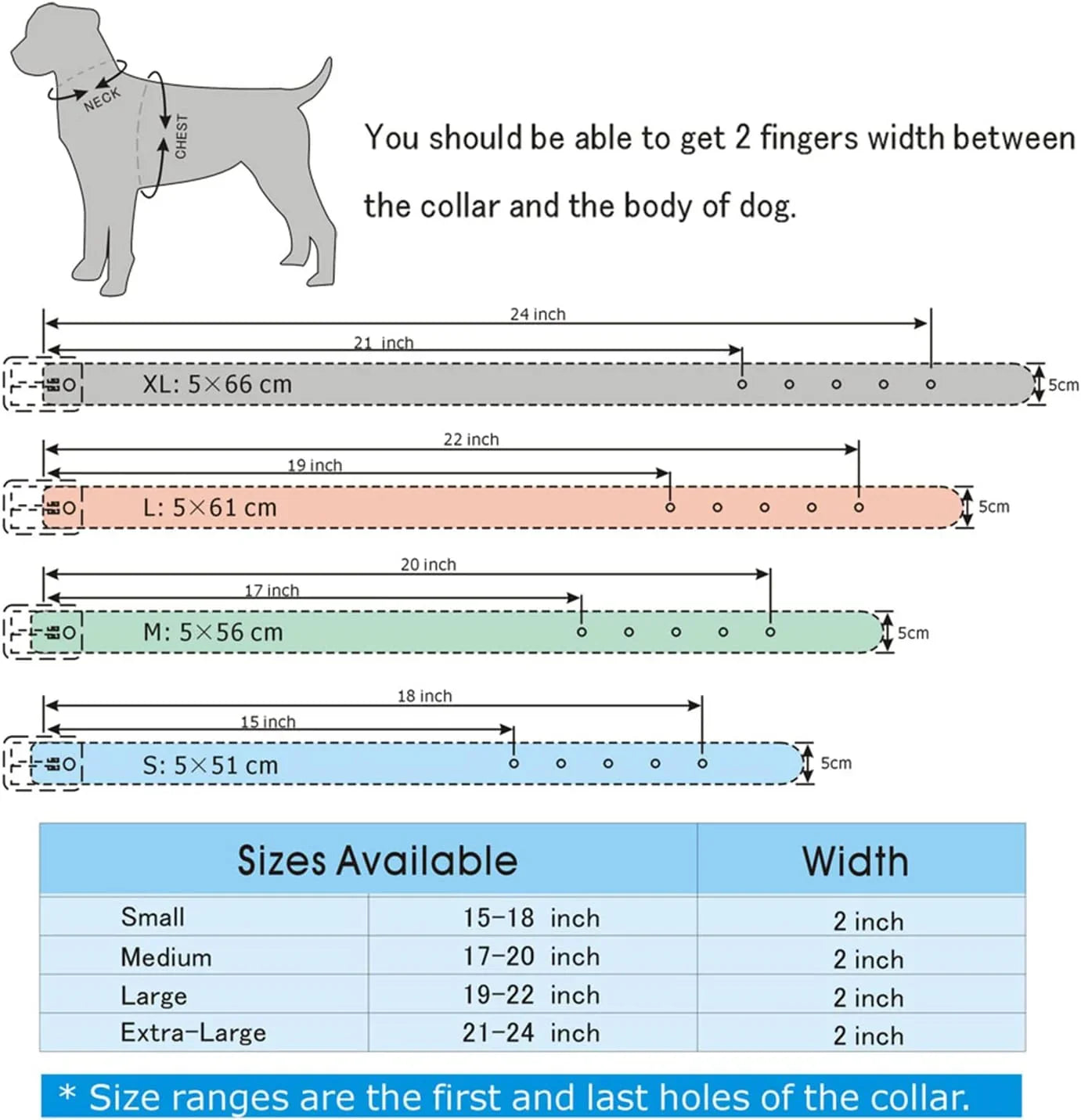 - 【Adjustable Leather Collar】 The spiked leather collar has 5 holes for size adjustment, about 2.36" can be adjusted. Please measure the neck girth carefully before purchase. Also the wide collars will ease pressures from dog's neck and lined with neoprene for added comfort.
