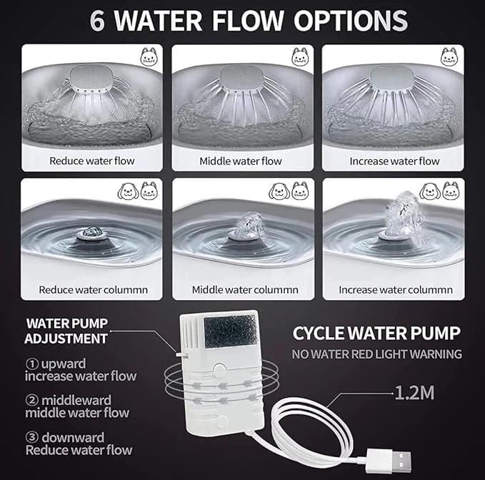 - [ULTRA-QUIET SMART PUMP] The pump is ultra-quiet and low energy consumption. In addition, when the fountain dries up, the pump will automatically shut down. Then, it will light up in red to remind you that you need more water (blue in working mode). You can also choose to turn on or off the LED lights.