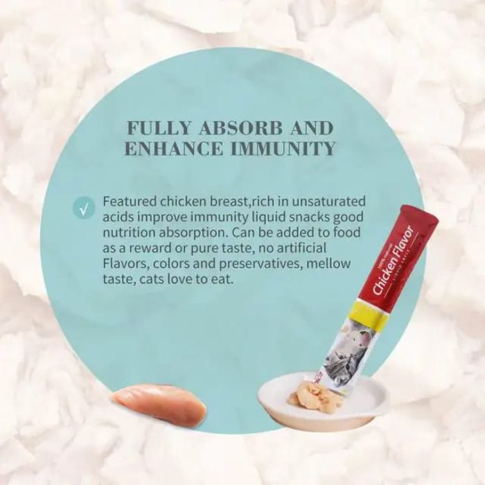 Order on WhatsAppFeatured chicken breast,rich in unsaturated acids improve immunity liquid snacks good nutrition absorption. Can be added to food as a reward or pure taste, no artificial Flavors, colors and preservatives, mellow taste, cats love to eat.
