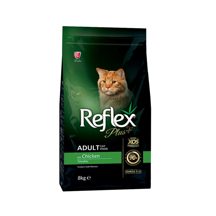 Reflex Plus Adult Cat Food with Chicken features a tasty chicken flavor that appeals to cats' taste buds. It is rich in vitamins, minerals, prebiotics, and antioxidants, and is a super premium cat food formulated with a complete and balanced formula suitable for all breeds over 12 months old.